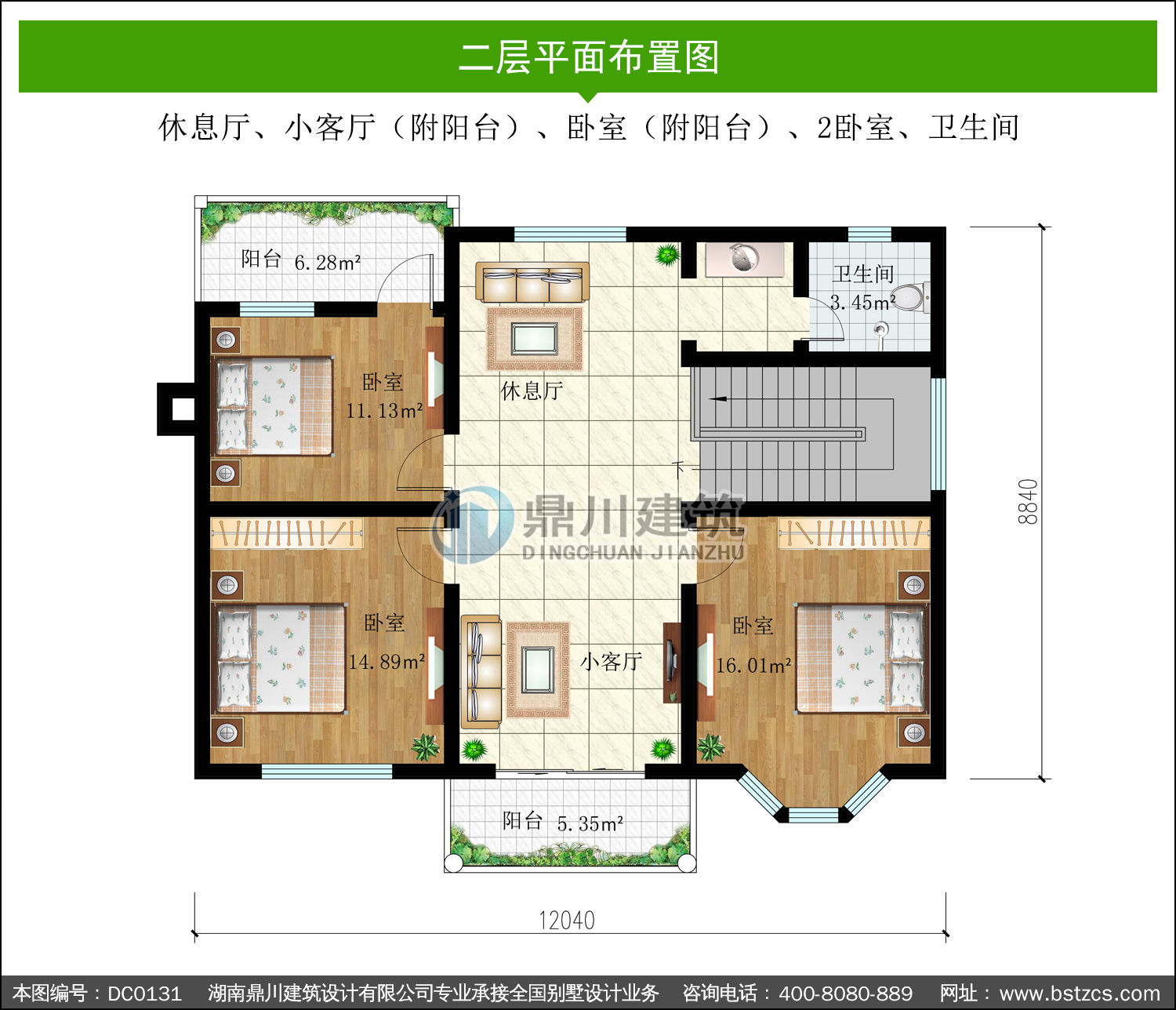 | 二 層: | 休息廳、小客廳(附陽臺)、臥室(附陽臺)、2臥室、衛生間 | |||
