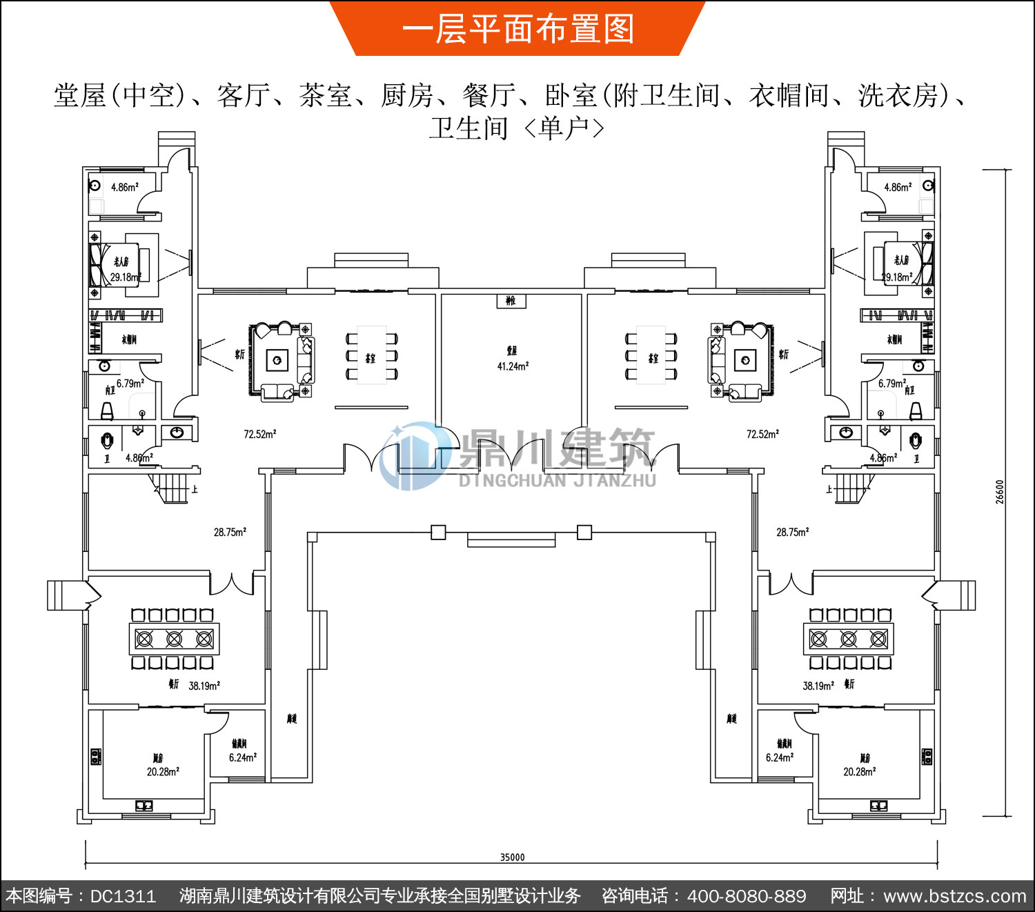 | 一 層: | 堂屋(中空)、客廳、茶室、廚房、餐廳、臥室(附衛生間、衣帽間、洗衣房)、衛生間 <單戶> | |||