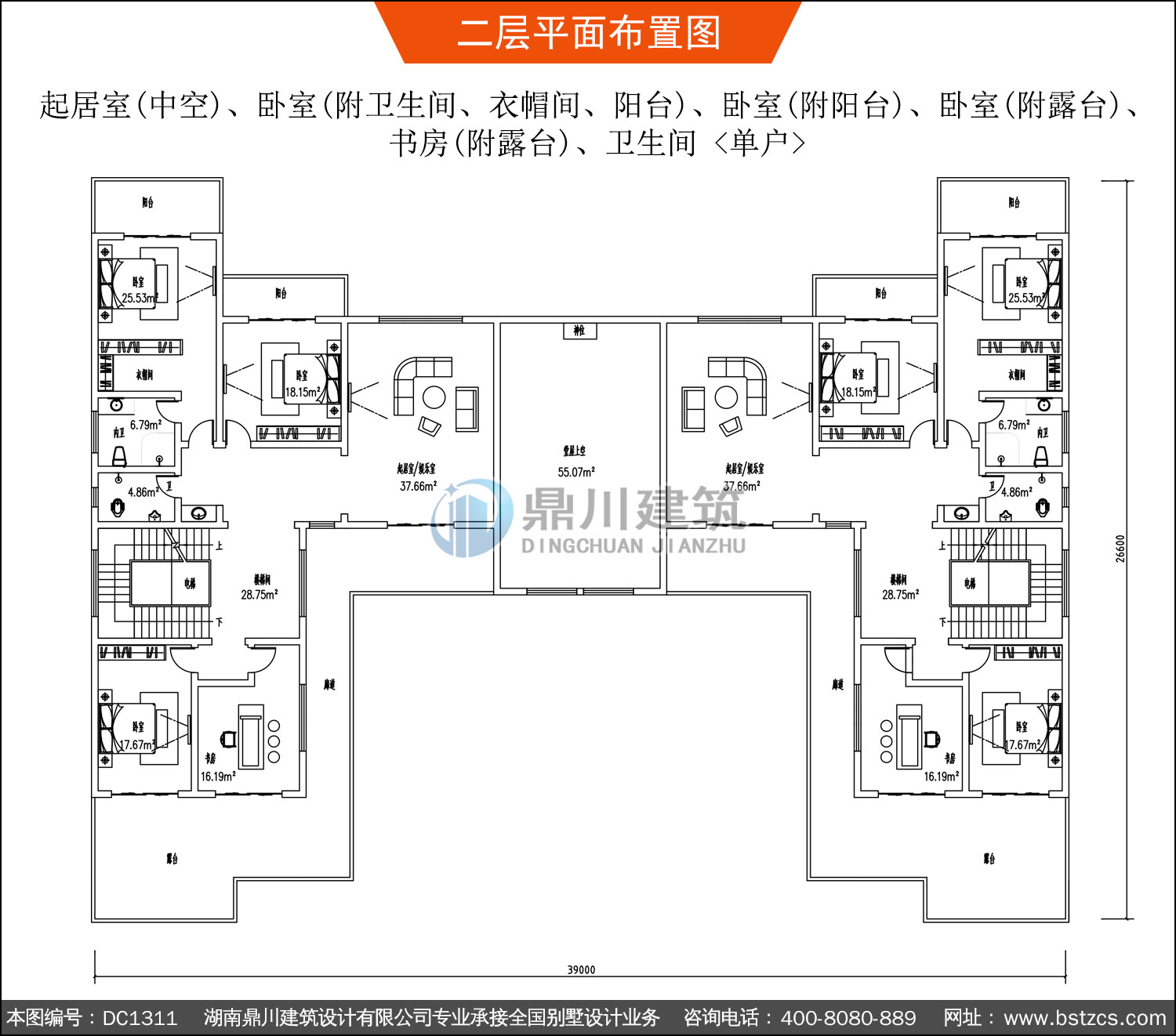| 二 層: | 起居室(中空)、臥室(附衛生間、衣帽間、陽臺)、臥室(附陽臺)、臥室(附露臺)、 書房(附露臺)、衛生間 <單戶> | |||