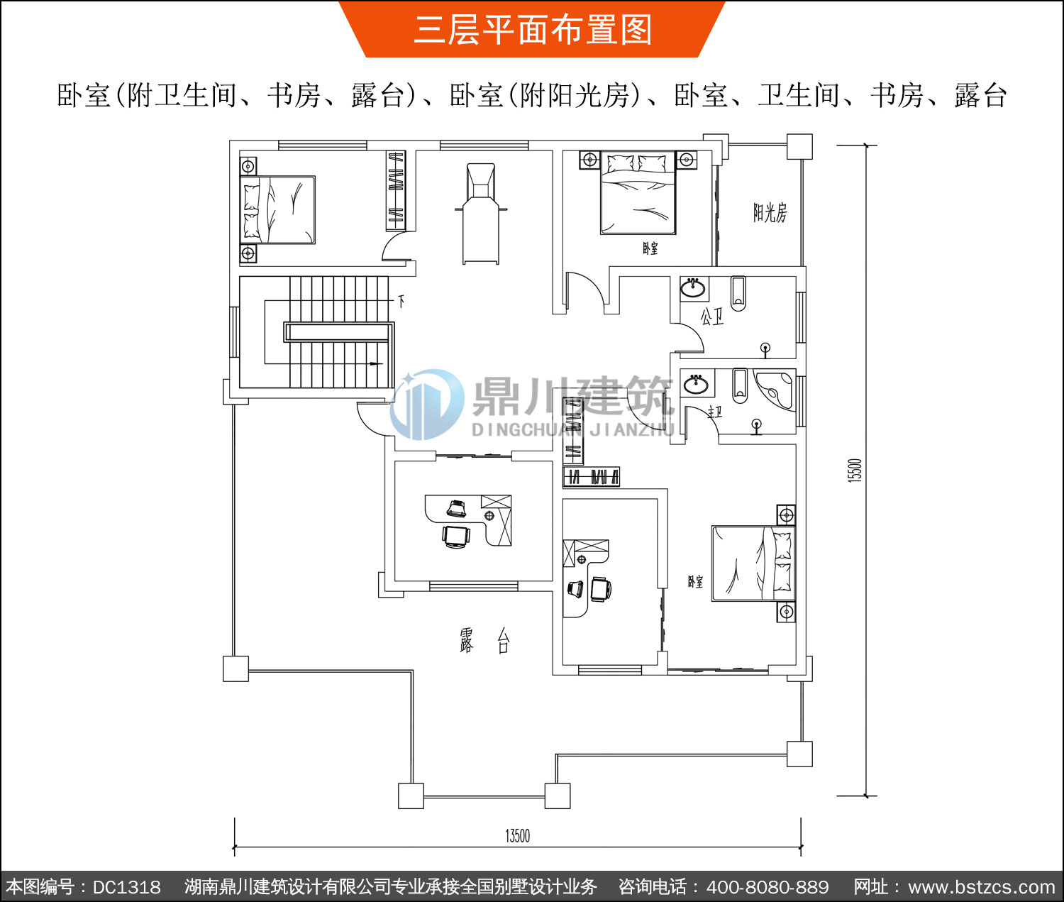 | 三 層: | 臥室(附衛生間、書房、露臺)、臥室(附陽光房)、臥室、衛生間、書房、露臺 | |||