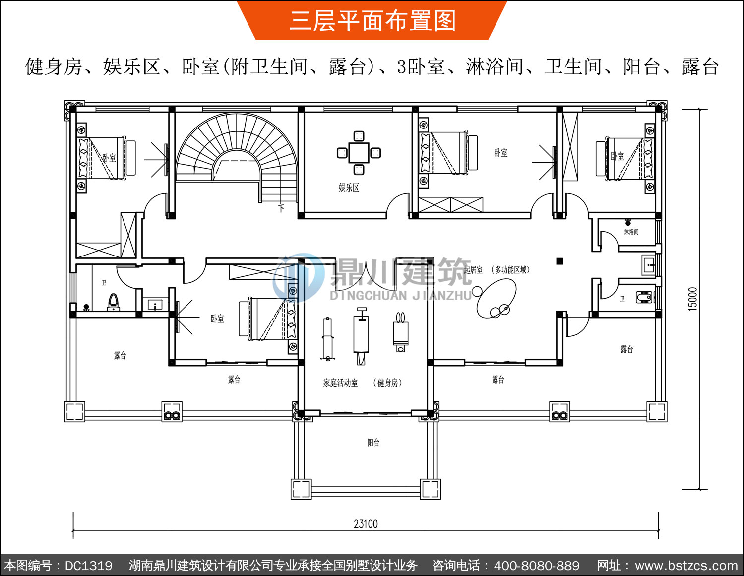 | 三 層: | 健身房、娛樂區、臥室(附衛生間、露臺)、3臥室、淋浴間、衛生間、陽臺、露臺 | |||