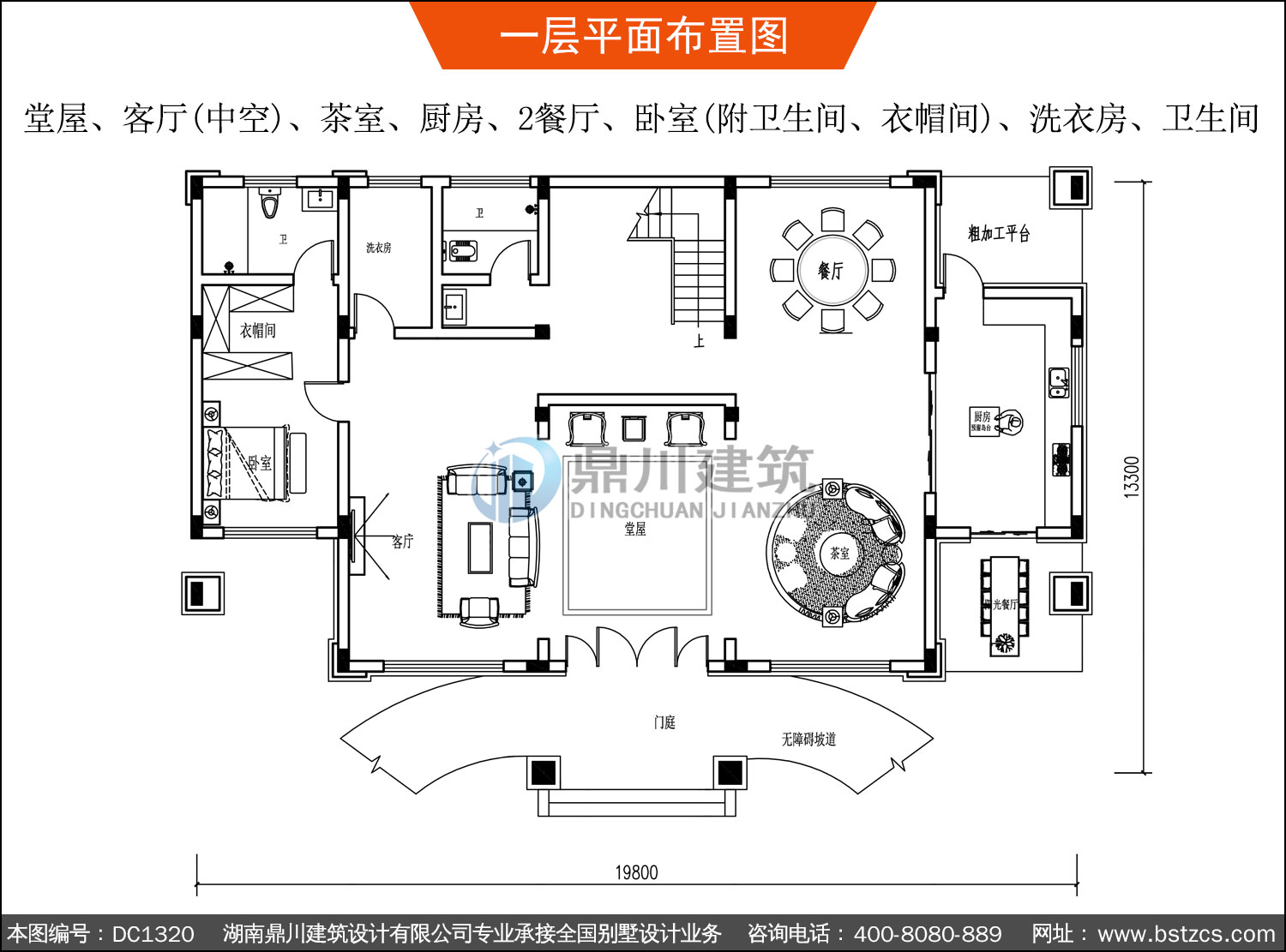 | 一 層: | 堂屋、客廳(中空)、茶室、廚房、2餐廳、臥室(附衛生間、衣帽間)、洗衣房、衛生間 | |||