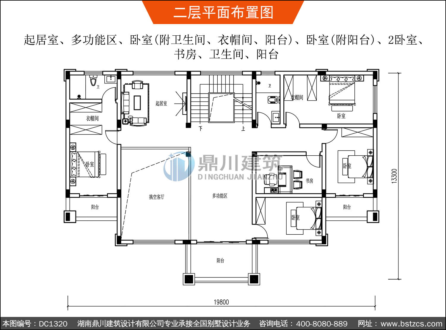 | 二 層: | 起居室、多功能區、臥室(附衛生間、衣帽間、陽臺)、臥室(附陽臺)、2臥室、書房、衛生間、陽臺 | |||