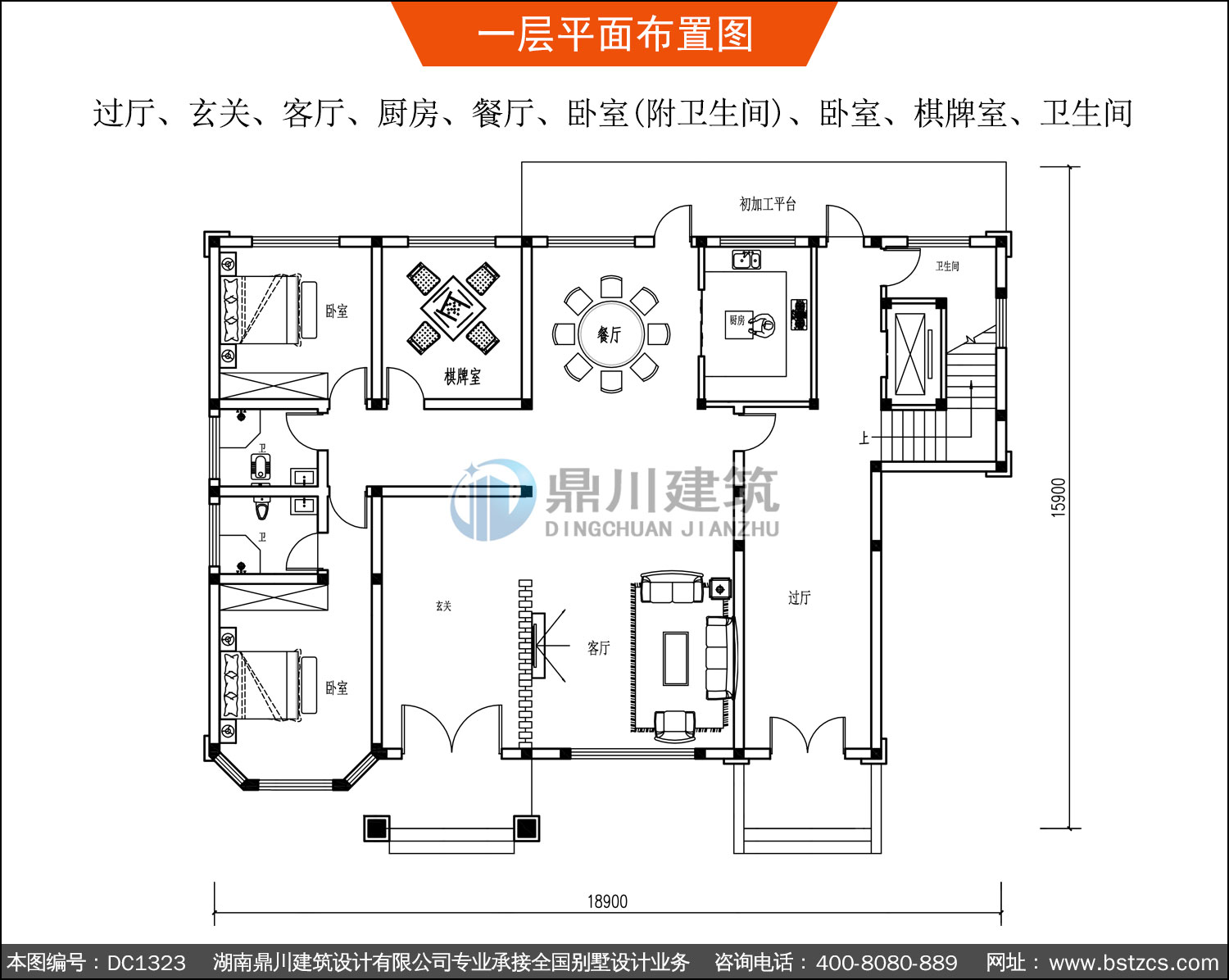 | 一 層: | 過廳、玄關、客廳、廚房、餐廳、臥室(附衛生間)、臥室、棋牌室、衛生間 | |||
