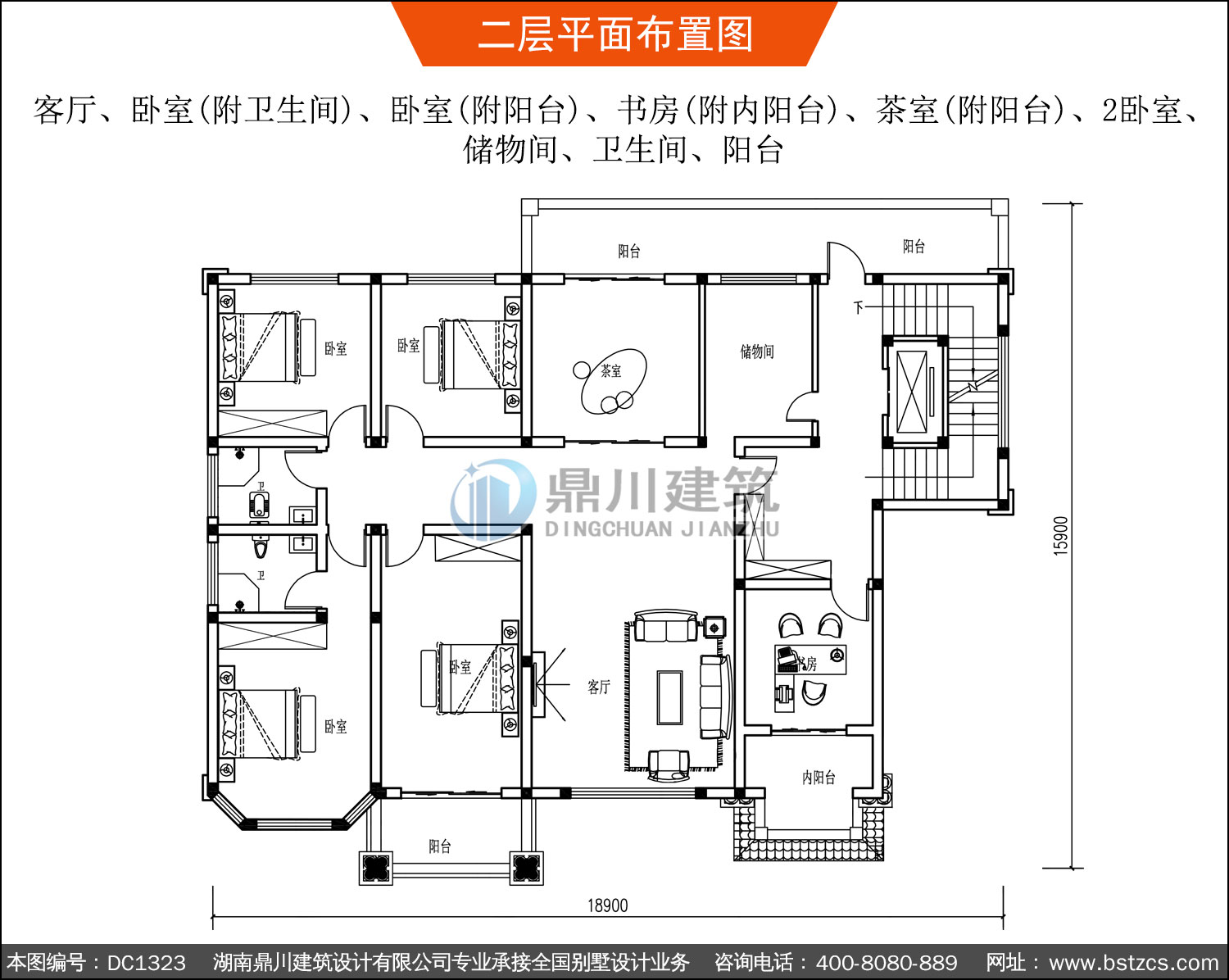 | 二 層: | 客廳、臥室(附衛生間)、臥室(附陽臺)、書房(附內陽臺)、茶室(附陽臺)、2臥室、儲物間、衛生間、陽臺 | |||