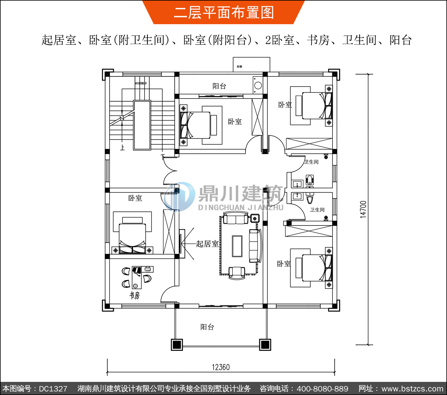 | 二 層: | 起居室、臥室(附衛生間)、臥室(附陽臺)、2臥室、書房、衛生間、陽臺 | |||
