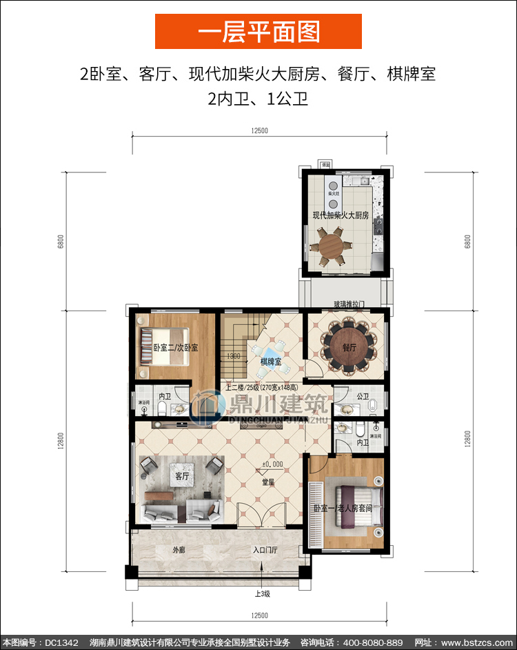 | 一 層: | 2臥室、客廳、現代加柴火大廚房、餐廳、棋牌室2內衛、1公衛 | |||