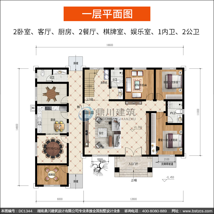 | 一 層: | 2臥室、客廳、廚房、2餐廳、棋牌室、娛樂室、1內衛、2公衛 | |||