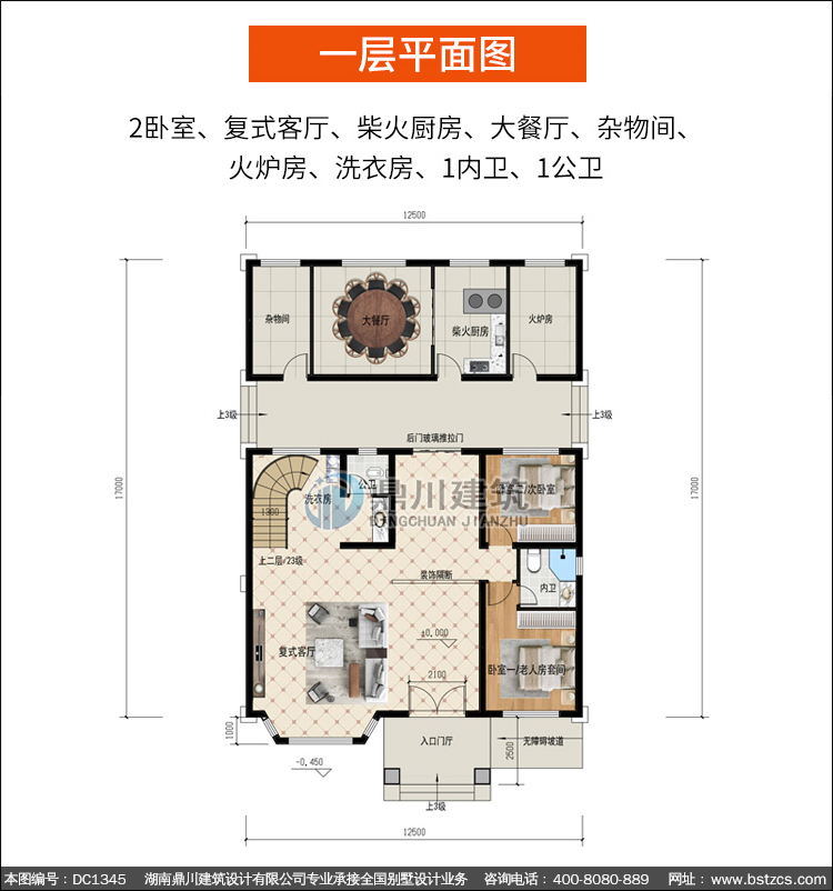 | 一 層: | 2臥室、復式客廳、柴火廚房、大餐廳、雜物間、火爐房、洗衣房、1內(nèi)衛(wèi)、1公衛(wèi) | |||