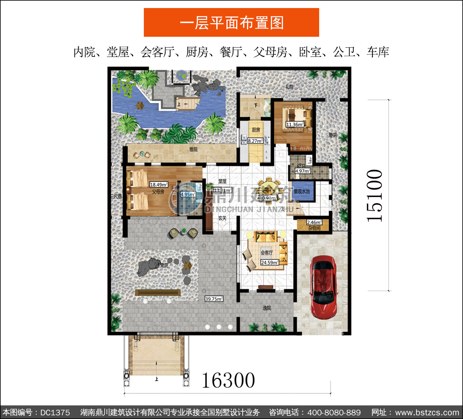 | 一 層: | 內院、堂屋、會客廳、廚房、餐廳、父母房、臥室、公衛、車庫 | |||