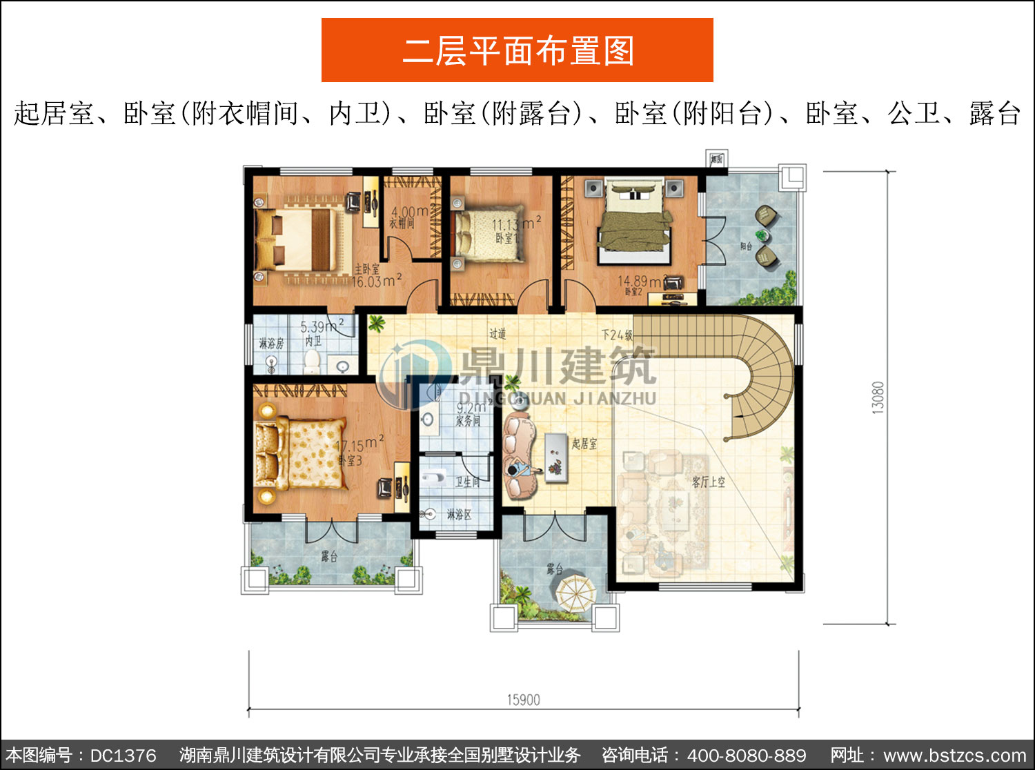 | 二 層: | 起居室、臥室(附衣帽間、內衛)、臥室(附露臺)、臥室(附陽臺)、臥室、公衛、露臺 | |||