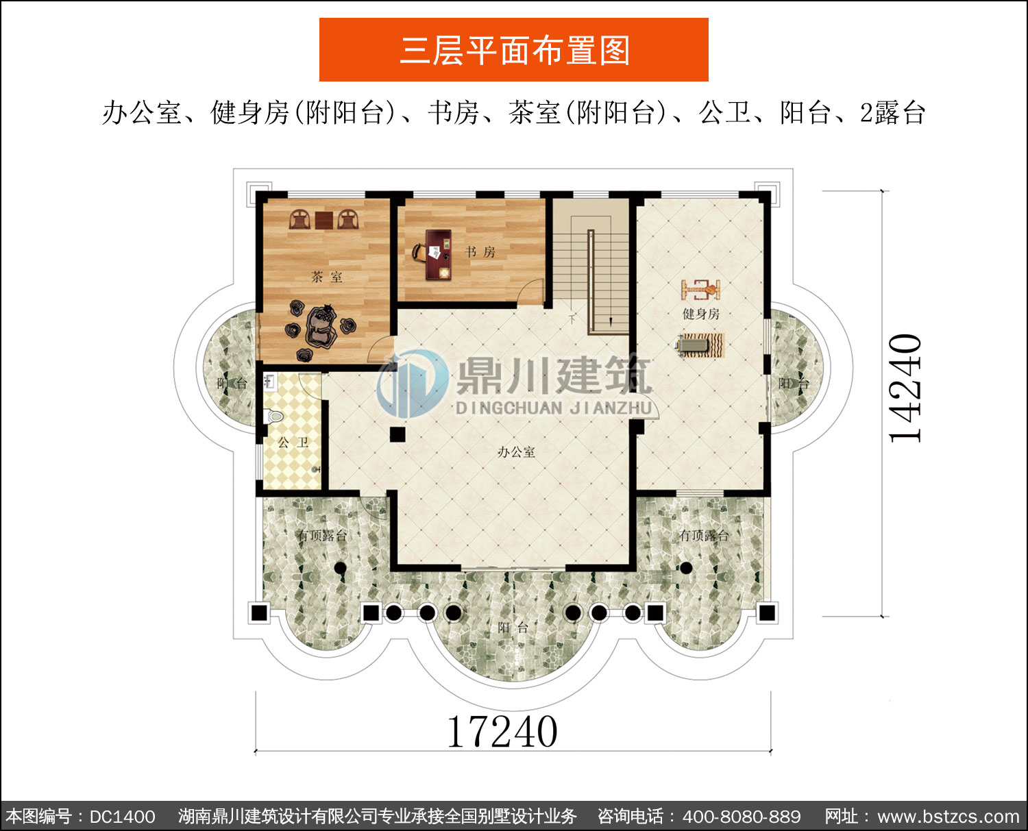 | 三 層: | 辦公室、健身房(附陽臺)、書房、茶室(附陽臺)、公衛(wèi)、陽臺、2露臺 | |||