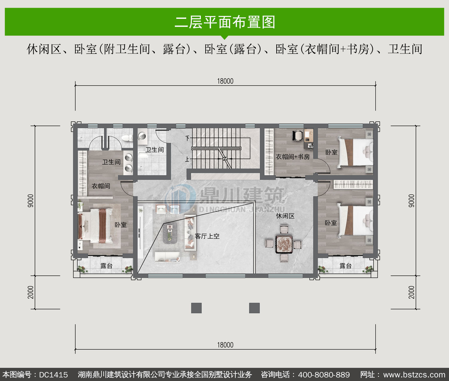 | 二 層: | 休閑區、臥室(附衛生間、露臺)、臥室(露臺)、臥室(衣帽間+書房)、衛生間 | |||