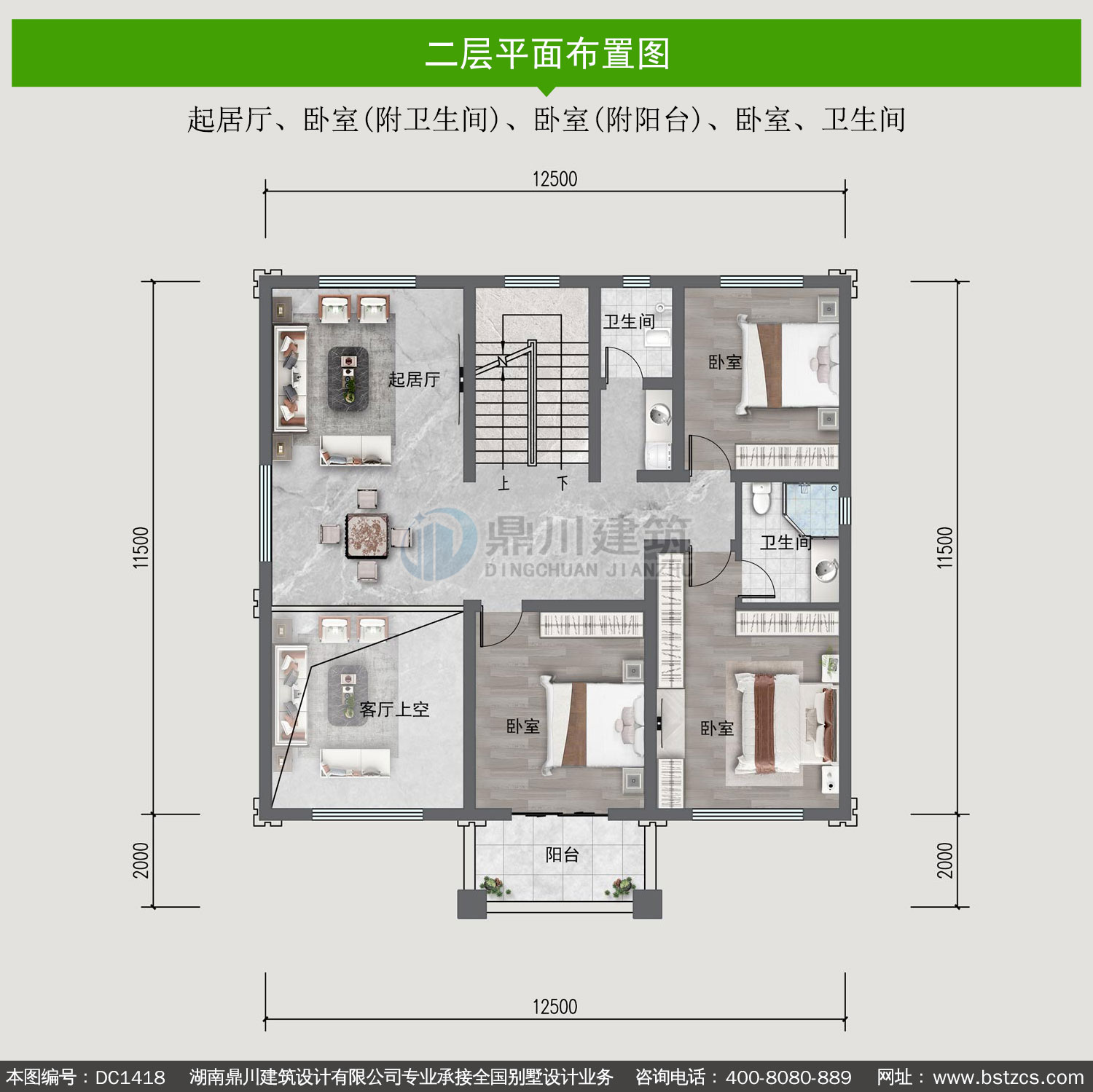 | 二 層: | 起居廳、臥室(附衛生間)、臥室(附陽臺)、臥室、衛生間 | |||