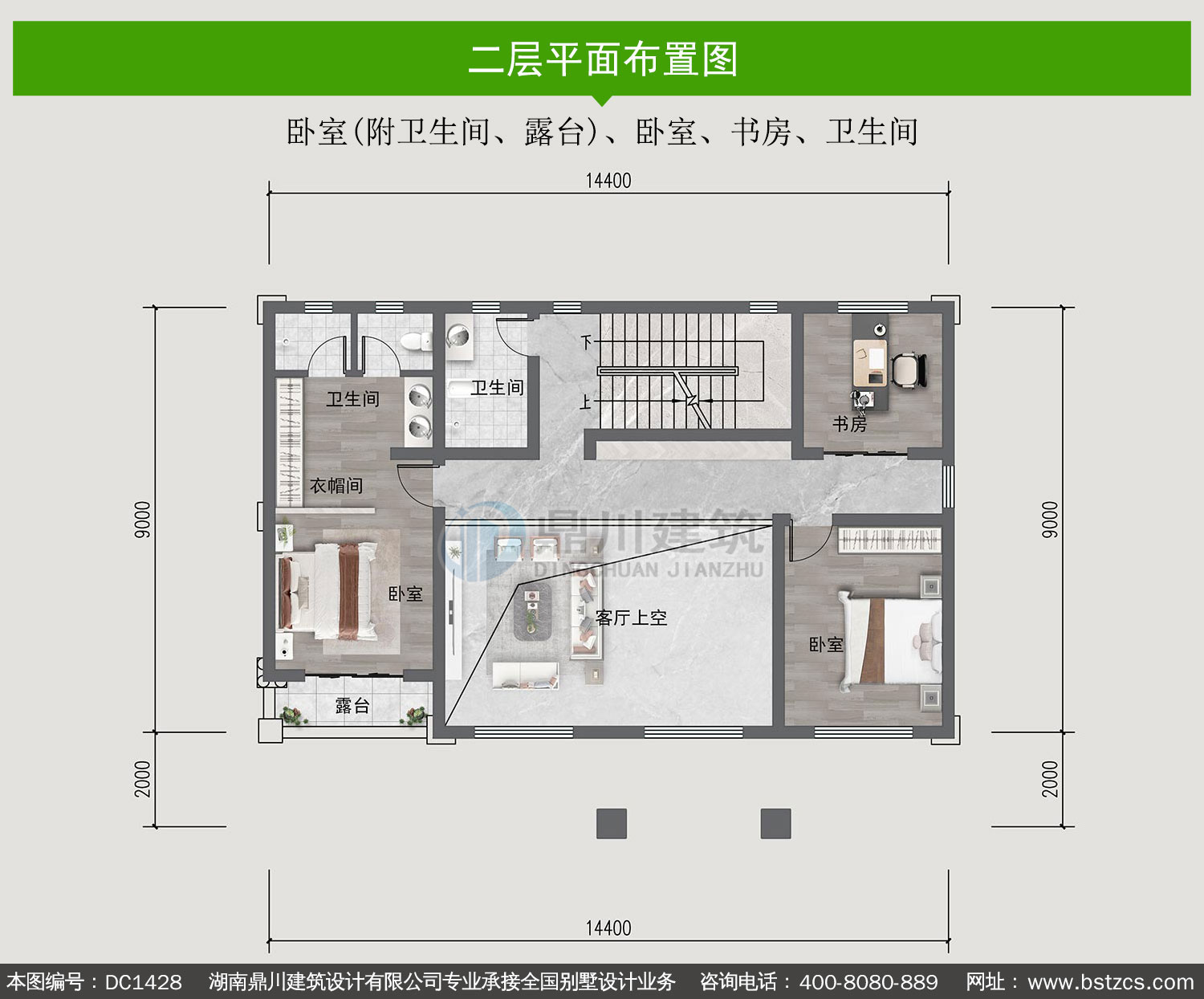 | 二 層: | 臥室(附衛(wèi)生間、露臺)、臥室、書房、衛(wèi)生間 | |||