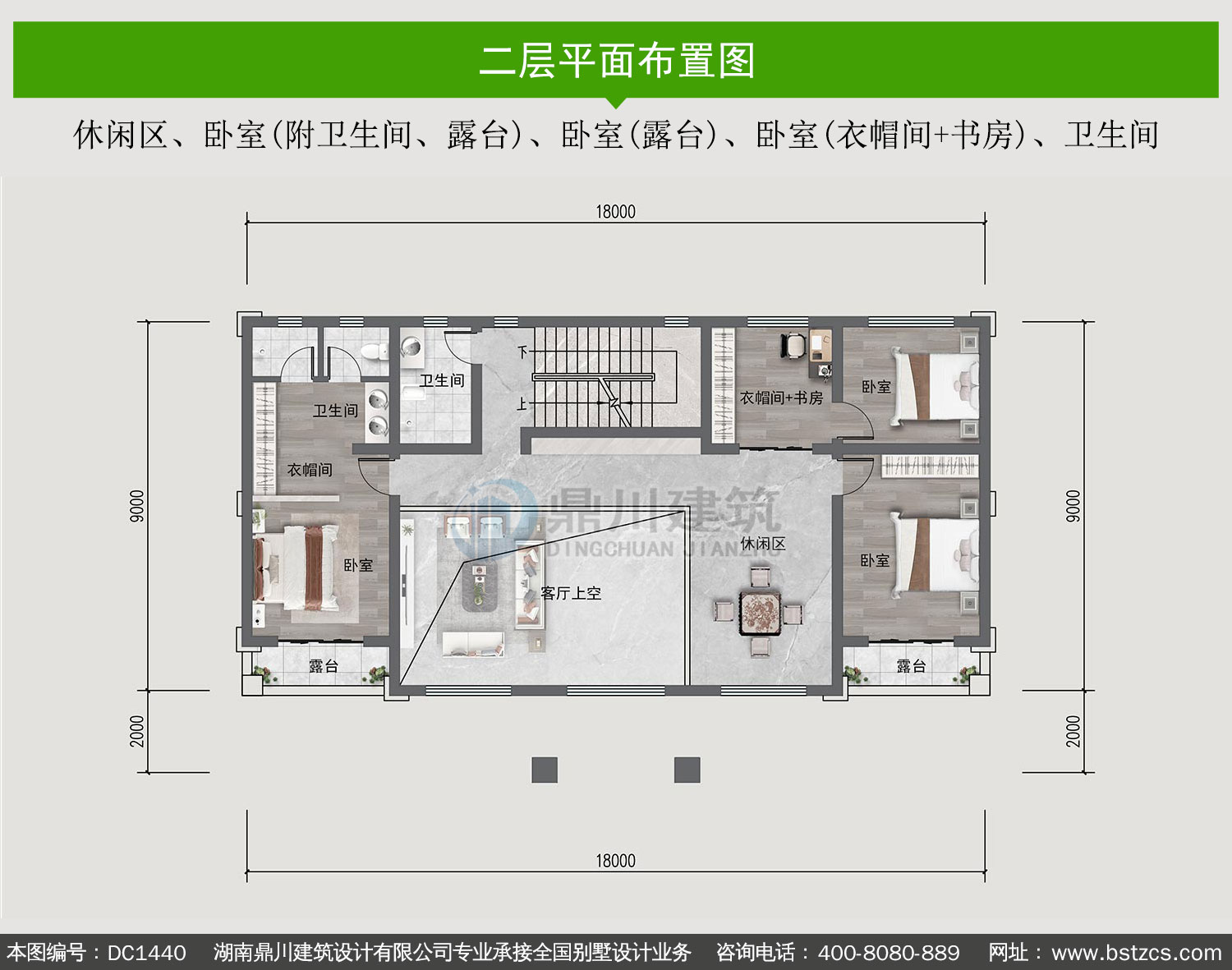 | 二 層: | 休閑區、臥室(附衛生間、露臺)、臥室(露臺)、臥室(衣帽間+書房)、衛生間 | |||