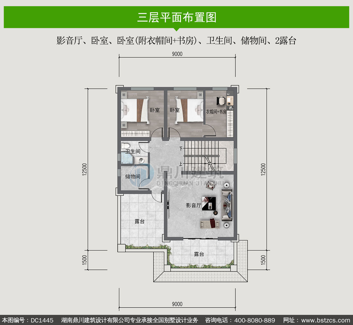 | 三 層: | 影音廳、臥室、臥室(附衣帽間+書房)、衛(wèi)生間、儲(chǔ)物間、2露臺(tái) | |||