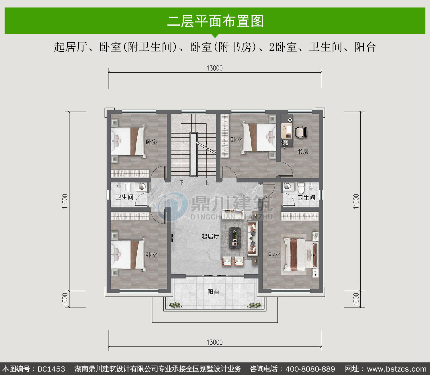 | 二 層: | 起居廳、臥室(附衛(wèi)生間)、臥室(附書房)、2臥室、衛(wèi)生間、陽臺 | |||