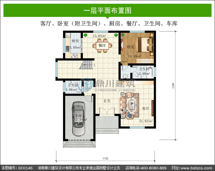 | 一 層: | 客廳、臥室(附衛生間)、廚房、餐廳、衛生間、車庫 | |||