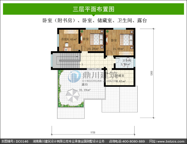 | 三 層: | 臥室(附書房)、臥室、儲藏室、衛生間、露臺 | |||