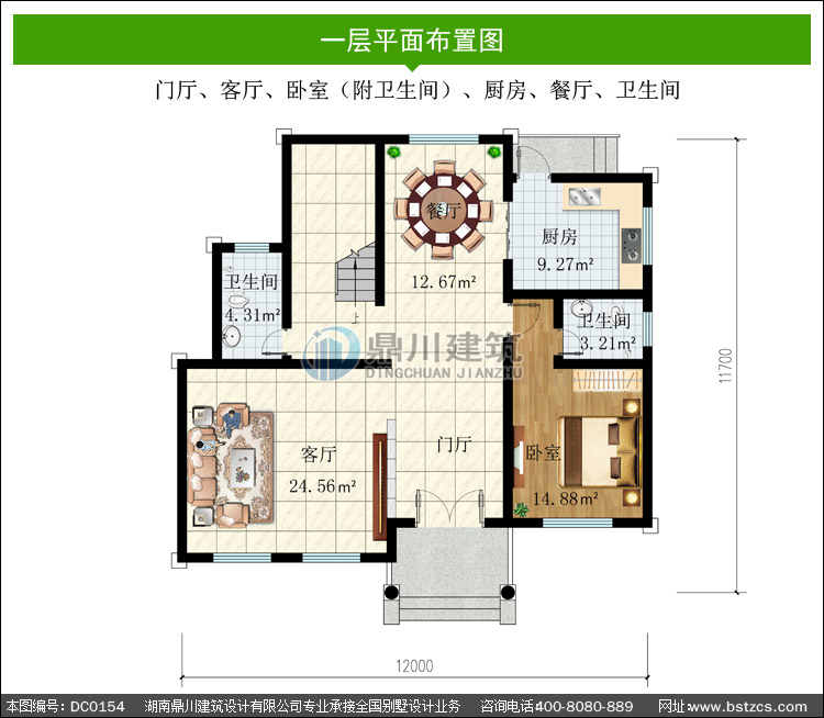 | 一 層: | 門廳、客廳、臥室(附衛生間)、廚房、餐廳、衛生間 | |||