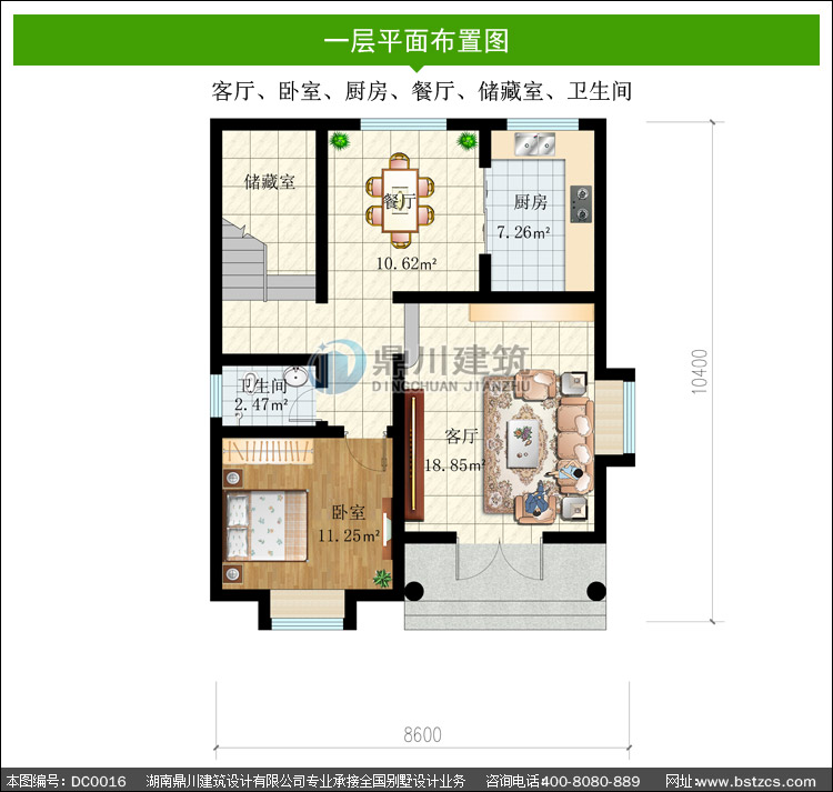| 一 層: | 客廳、臥室、廚房、餐廳、儲藏室、衛生間 | |||