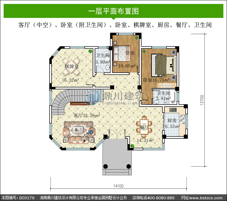 | 一 層: | 客廳(中空)、臥室(附衛生間)、臥室、棋牌室、廚房、餐廳、衛生間 | |||