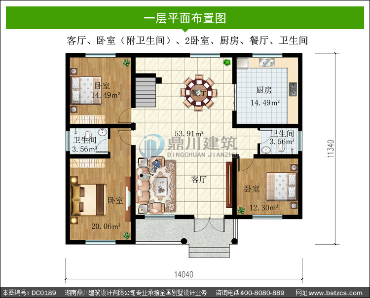 | 一 層: | 客廳、臥室(附衛生間)、2臥室、廚房、餐廳、衛生間 | |||
