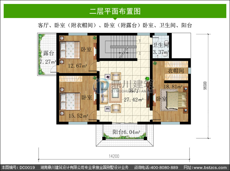 | 二 層: | 客廳、臥室(附衣帽間)、臥室(附露臺)、臥室、衛生間、陽臺 | |||