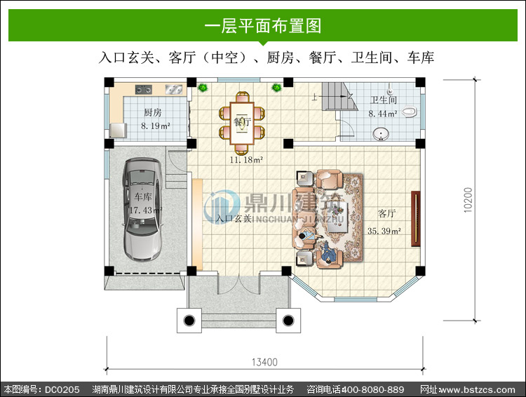 | 一 層: | 入口玄關、客廳(中空)、廚房、餐廳、衛生間、車庫 | |||