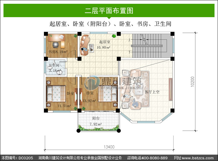 | 二 層: | 起居室、臥室(附陽臺)、臥室、書房、衛生間 | |||