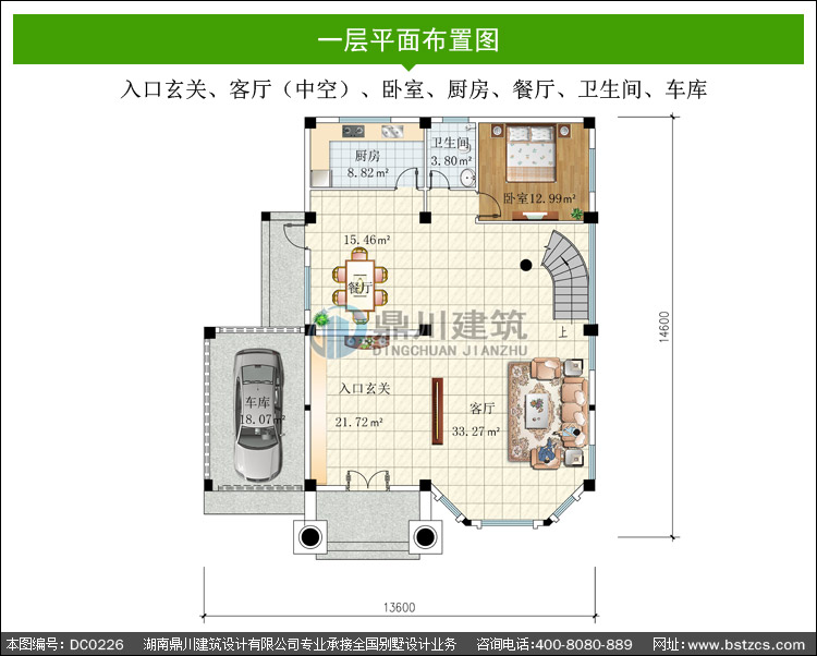 | 一 層: | 入口玄關、客廳(中空)、臥室、廚房、餐廳、衛生間、車庫 | |||