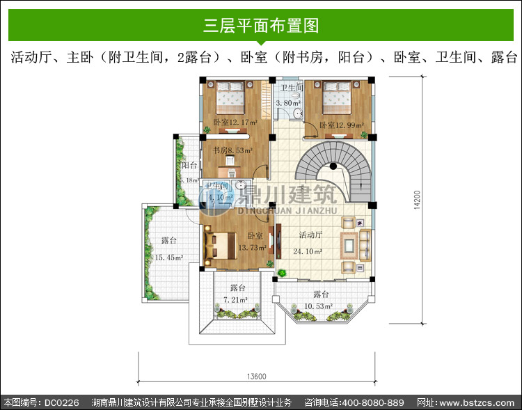 | 三 層: | 活動廳、主臥(附衛生間,2露臺)、臥室(附書房,陽臺)、臥室、衛生間、露臺 | |||
