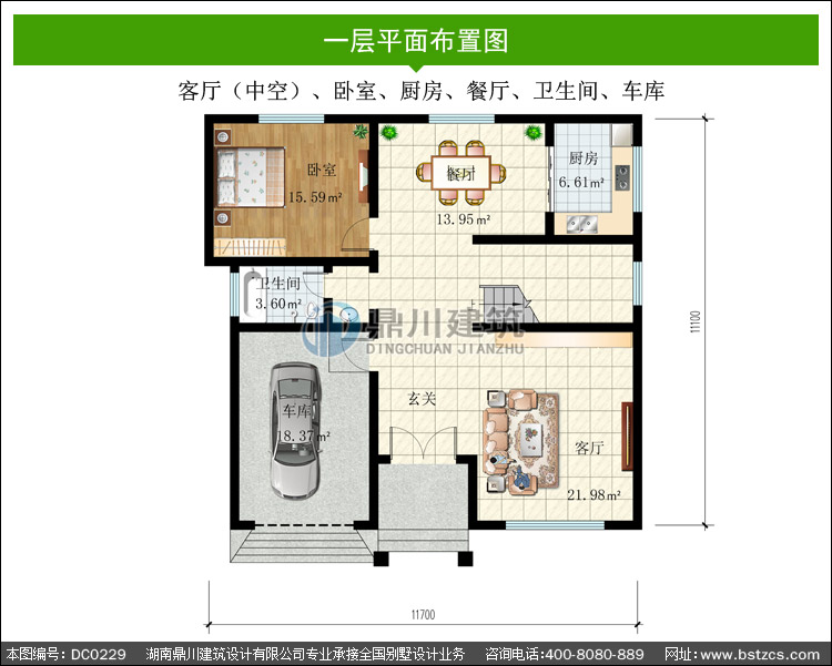 | 一 層: | 客廳(中空)、臥室、廚房、餐廳、衛(wèi)生間、車庫 | |||