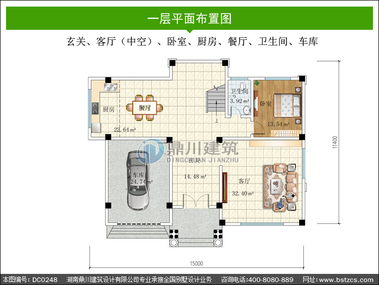 | 一 層: | 玄關、客廳(中空)、臥室、廚房、餐廳、衛生間、車庫 | |||