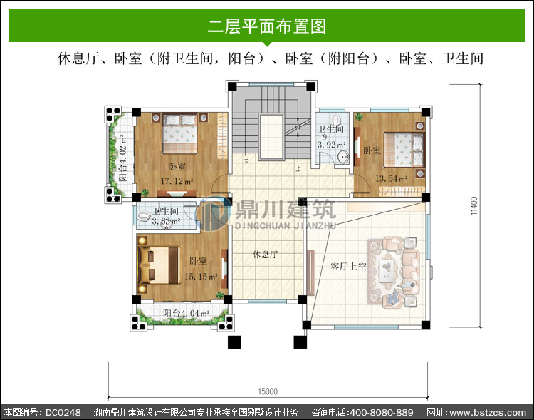 | 二 層: | 休息廳、臥室(附衛生間,陽臺)、臥室(附陽臺)、臥室、衛生間 | |||