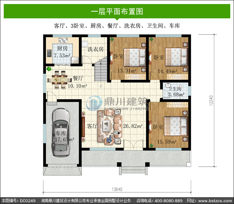 | 一 層: | 客廳、3臥室、廚房、餐廳、洗衣房、衛生間、車庫 | |||
