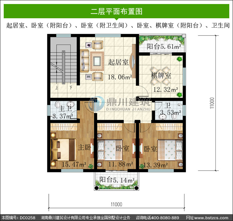 | 二 層: | 起居室、臥室(附陽臺)、臥室(附衛生間)、臥室、棋牌室(附陽臺)、衛生間 | |||