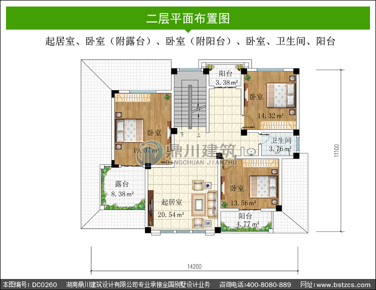 | 二 層: | 起居室、臥室(附露臺)、臥室(附陽臺)、臥室、衛生間、陽臺 | |||