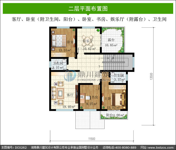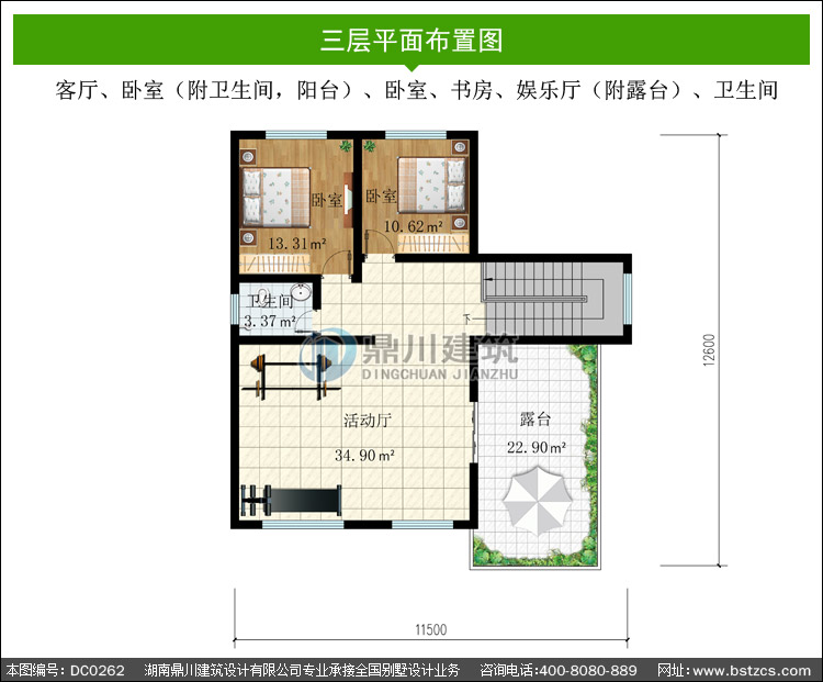 | 二 層: | 客廳、臥室(附衛生間,陽臺)、臥室、書房、娛樂廳(附露臺)、衛生間 | |||