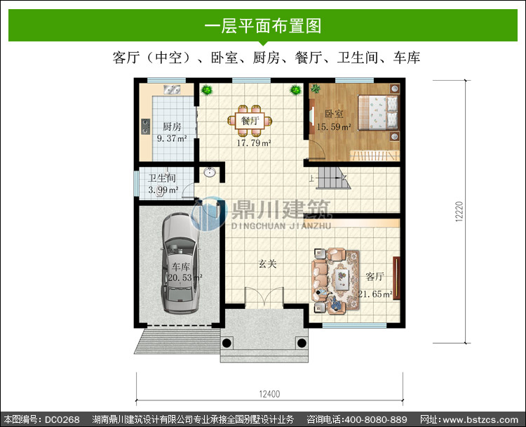 | 一 層: | 客廳(中空)、臥室、廚房、餐廳、衛(wèi)生間、車庫 | |||