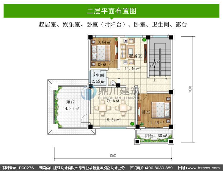 | 二 層: | 起居室、娛樂室、臥室(附陽臺)、臥室、衛生間、露臺 | |||