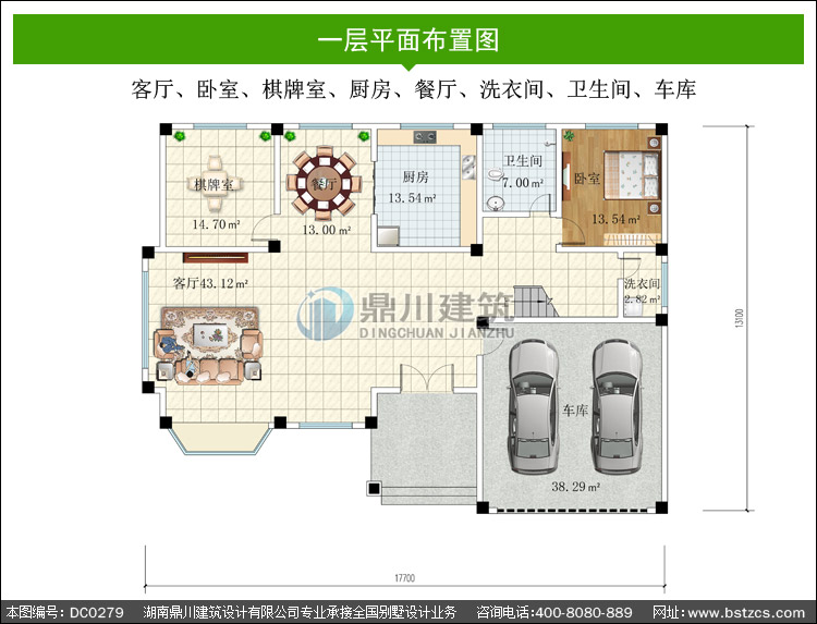 | 一 層: | 客廳、臥室、棋牌室、廚房、餐廳、洗衣間、衛生間、車庫 | |||