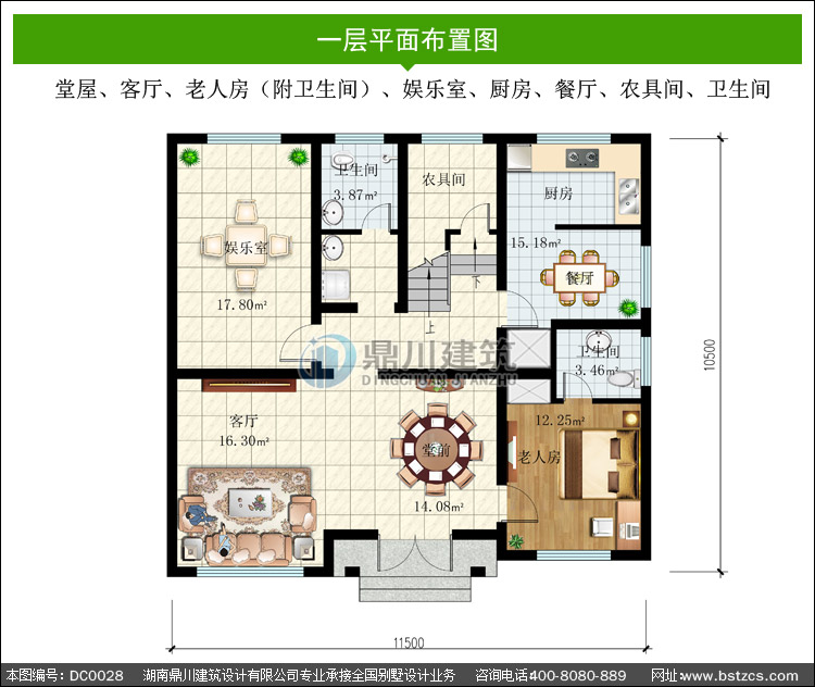 | 一 層: | 堂屋、客廳、老人房(附衛生間)、娛樂室、廚房、餐廳、農具間、衛生間 | |||