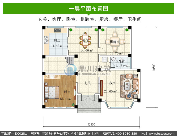 | 一 層: | 玄關(guān)、客廳、臥室、棋牌室、廚房、餐廳、衛(wèi)生間 | |||