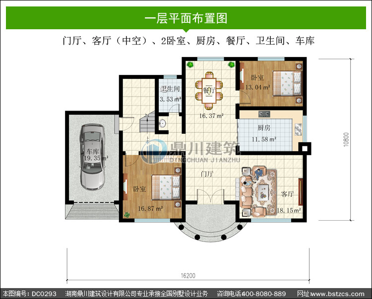| 一 層: | 門廳、客廳(中空)、2臥室、廚房、餐廳、衛生間、車庫 | |||