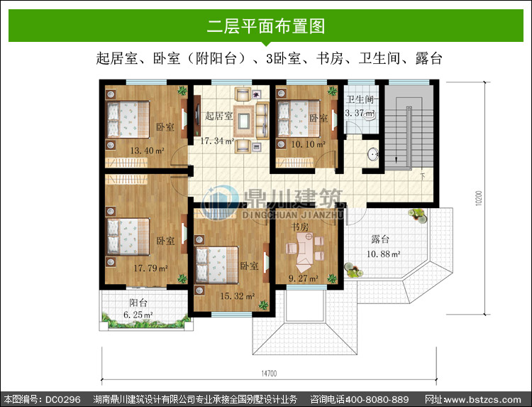 | 二 層: | 起居室、臥室(附陽臺)、3臥室、書房、衛(wèi)生間、露臺 | |||