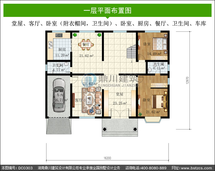 | 一 層: | 堂屋、客廳、臥室(附衣帽間,衛生間)、臥室、廚房、餐廳、衛生間、車庫 | |||