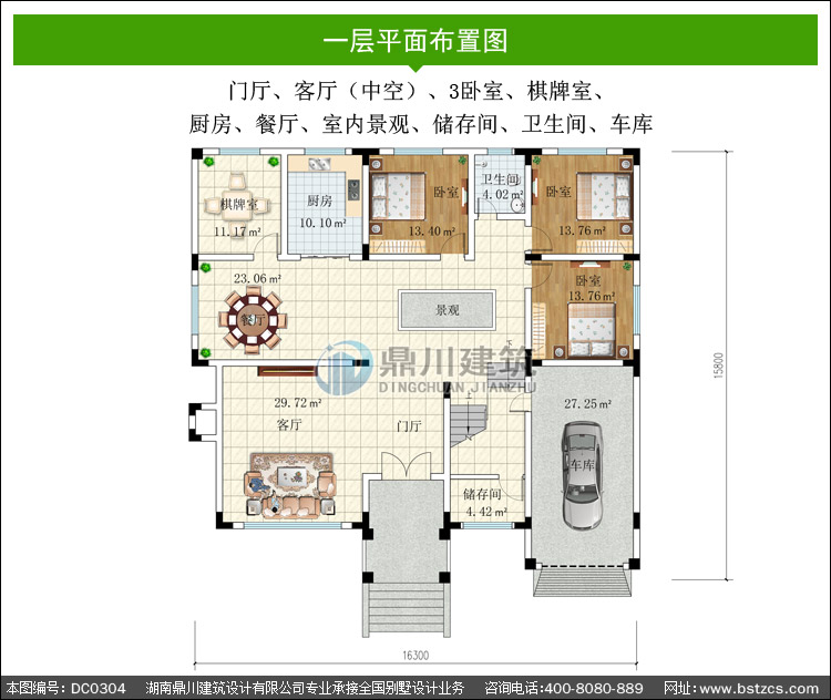 | 一 層: | 門廳、客廳(中空)、3臥室、棋牌室、廚房、餐廳、室內景觀、儲存間、衛生間、車庫 | |||