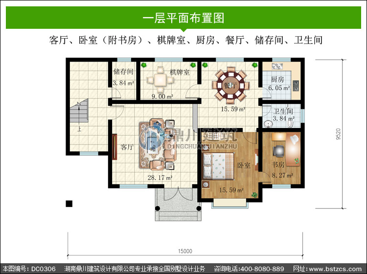 | 一 層: | 客廳、臥室(附書房)、棋牌室、廚房、餐廳、儲存間、衛(wèi)生間 | |||